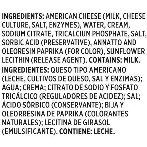 • American cheese (milk, cheese cultures, salt, enzymes), water, milkfat, whey protein concentrate, whey, sodium citrate, salt, sorbic acid as a preservative, and annatto and oleoresin paprika (color added). contains: milk.