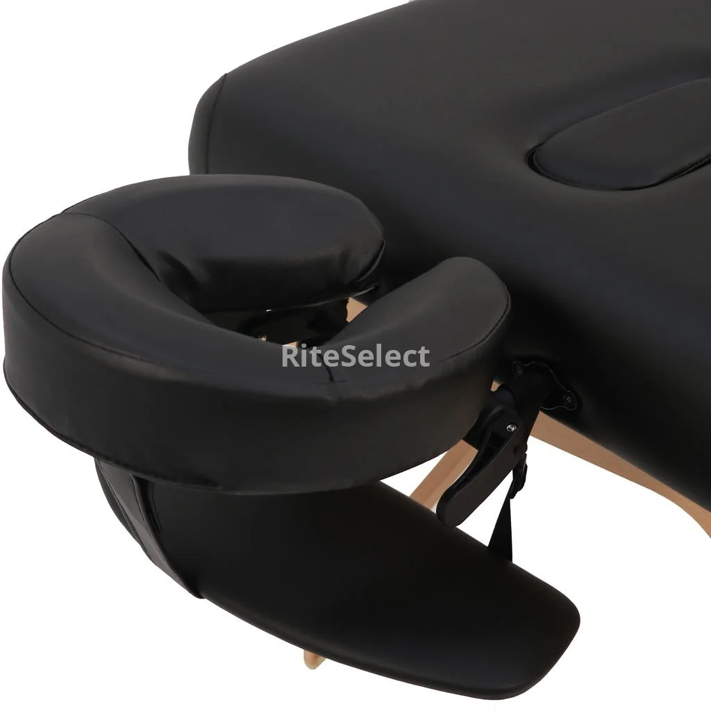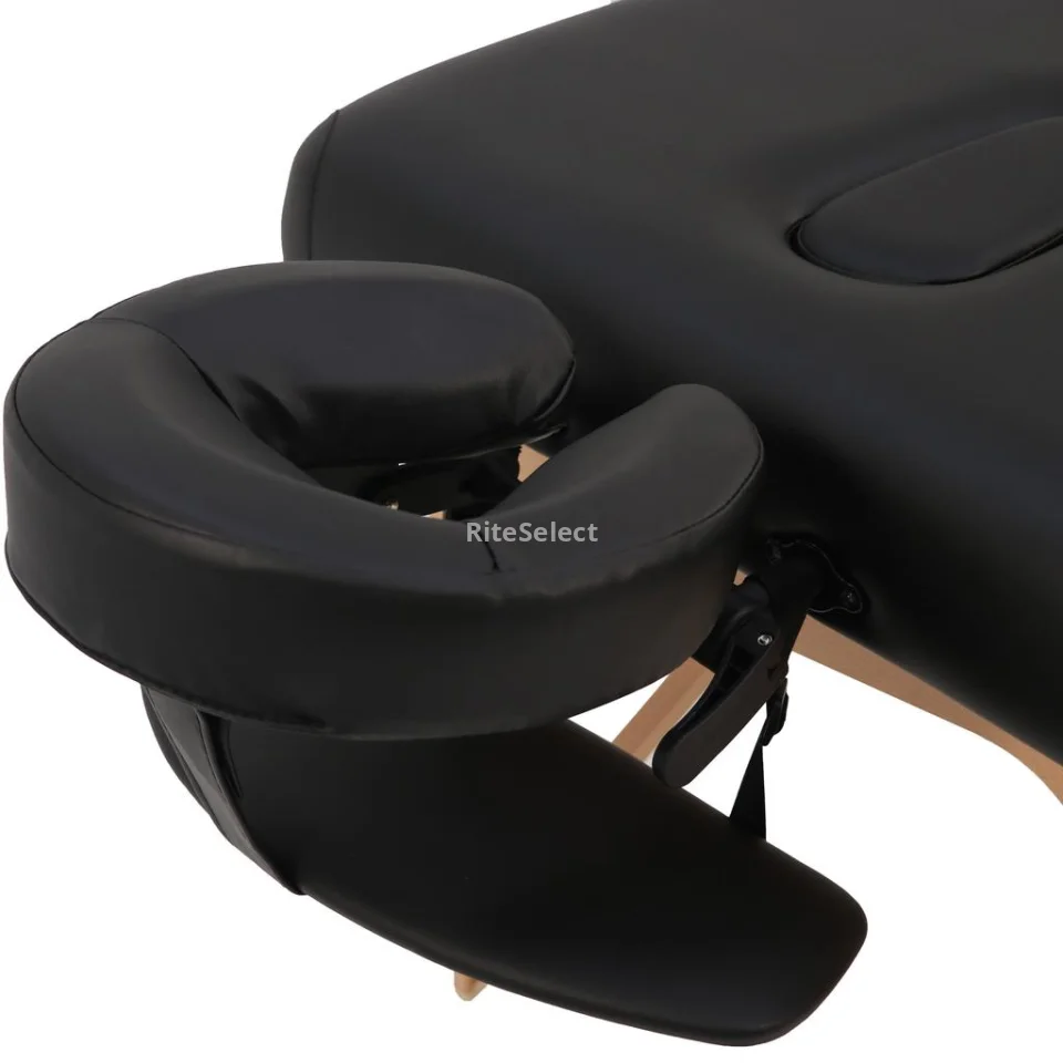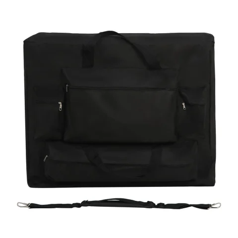 Includes adjustable, ergonomic face support, disposable face pillow, disposable pillow covers, contoured armrest, and carrying case with 4 pockets. Back elevation provides added comfort. A stabilizing bar adds strength and helps open and close your table. Dual luggage-style table locks. Maximum capacity is 295 kg or 650 lb. | Extended dimensions are 182.8 cm x 76.2 cm x 60.9-86.3 cm / 72" x 30" x 24"-34" and folded 91.4 cm x 20.3 cm x 77.4 cm / 36" x 8" x 30.5" | Weight: 29 kg / 64 lb. | Materials: 10% steel, 45% wood, 35% foam, 10% vinyl (polyurethane) | Made in China.