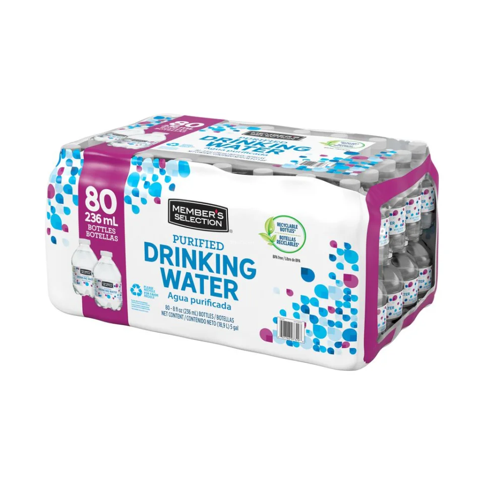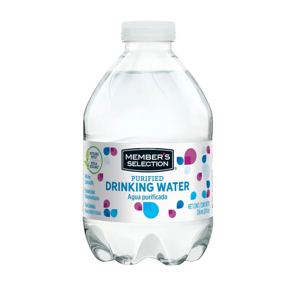 Brand: Member’s Selection | Product: purified water | Content: 80 Units | Content per Unit: 236 mL / 8 oz | Approximate total content: 18.9 L | Packaging material: recyclable plastic | Composition: BPA free | Country of origin: United States | Taste: neutral | Use: household and commercial | Storage: store in a cool dry place protected from direct sunlight and heat sources.