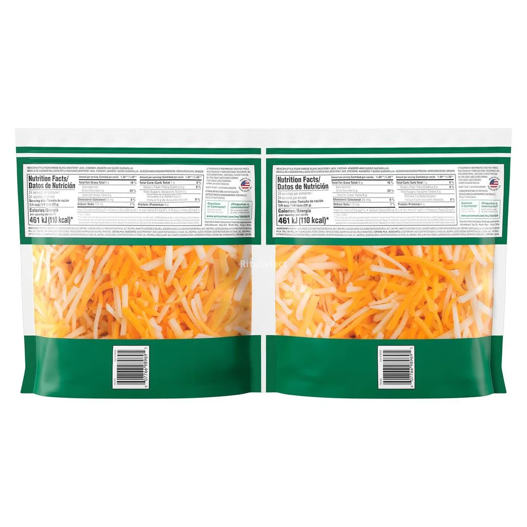 • Monterey cheese (cultured pasteurized milk, salt, enzymes), Cheddar cheese (cultured pasteurized milk, salt, enzymes, annatto extract [natural colorant]), Asadero cheese (cultured pasteurized milk, salt, enzymes), White cheese (cultured pasteurized milk, salt, enzymes), anti-caking blend (potato starch, tapioca starch, natamycin [preservative]).