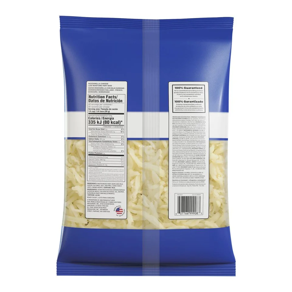 • An imported product, our shredded, low-fat, low moisture mozzarella cheese is an excellent source of calcium for your daily diet. Contains 2.26 kg / 5 lb of cheese, a convenient amount for a variety of meals and dishes. Ideal for adding to pastas, salads, pizzas, fruit and more.