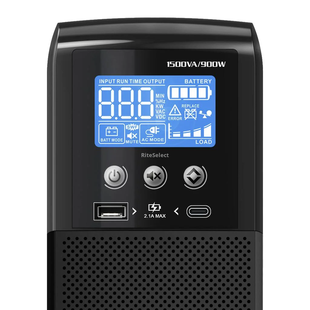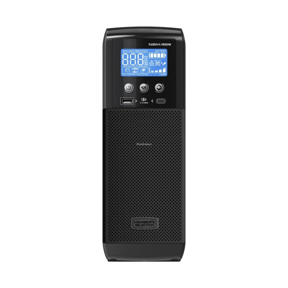 • The Member's Selection ST-1500MS smart UPS battery backup is an advanced solution for protecting electronic equipment in demanding environments. With a capacity of 1 500 VA / 900 W, this system combines automatic voltage regulation (AVR), surge suppression, and power backup to keep critical devices running during power outages and voltage fluctuations. Its interactive LCD screen allows real-time monitoring of battery status, load levels, and overall system conditions. Additionally, it features 10 surge-protected outlets, 5 of which provide battery backup, ensuring operational continuity for essential equipment. Its flame-retardant plastic construction and easy battery replacement guarantee safe and long-lasting use.