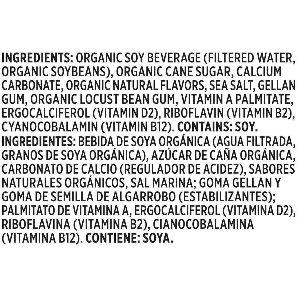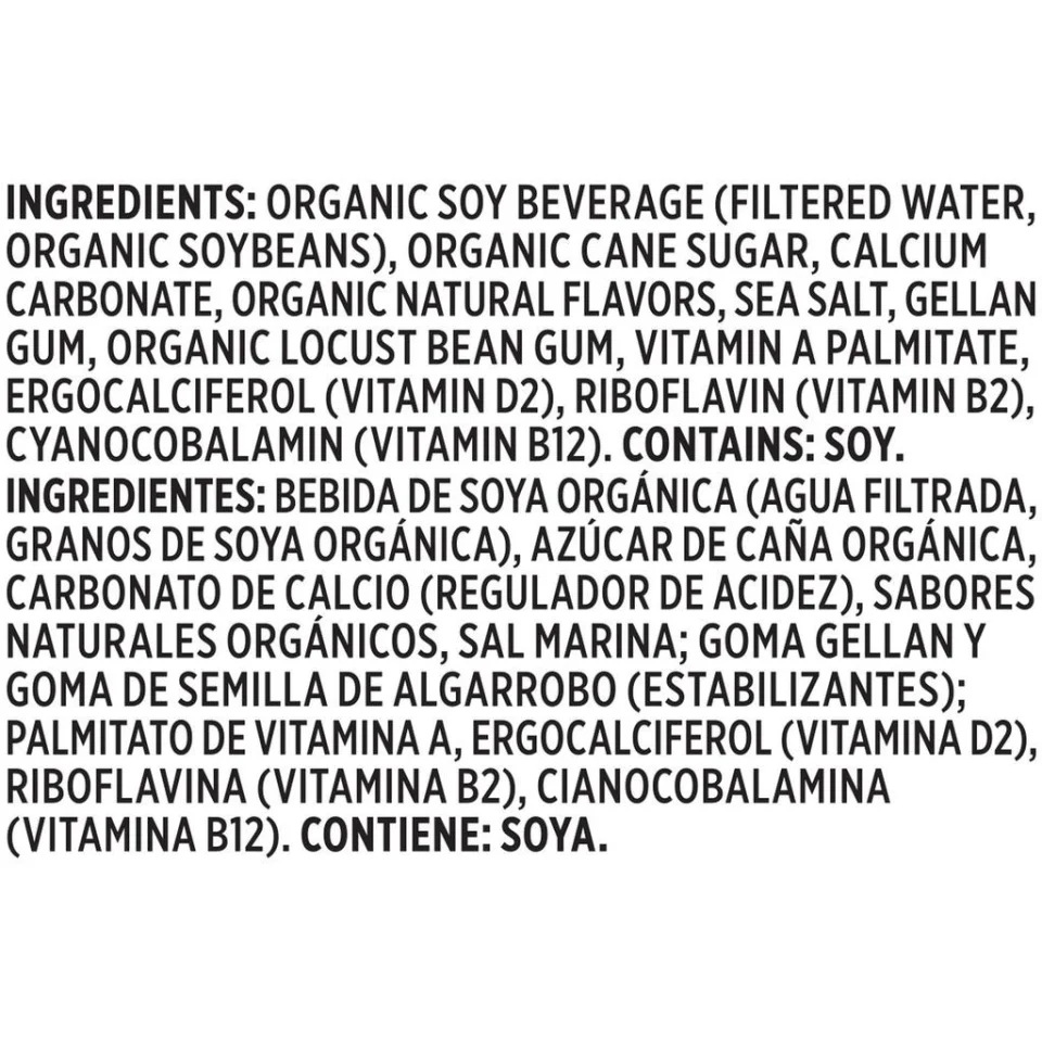 • Organic soy beverage (filtered water, organic soybeans), organic cane sugar, calcium carbonate, organic natural flavors, sea salt, gellan gum, organic locust bean gum, vitamin A palmitate, ergocalciferol (vitamin D2), riboflavin (vitamin B2), cyanocobalamin (vitamin B12). Contains soy.