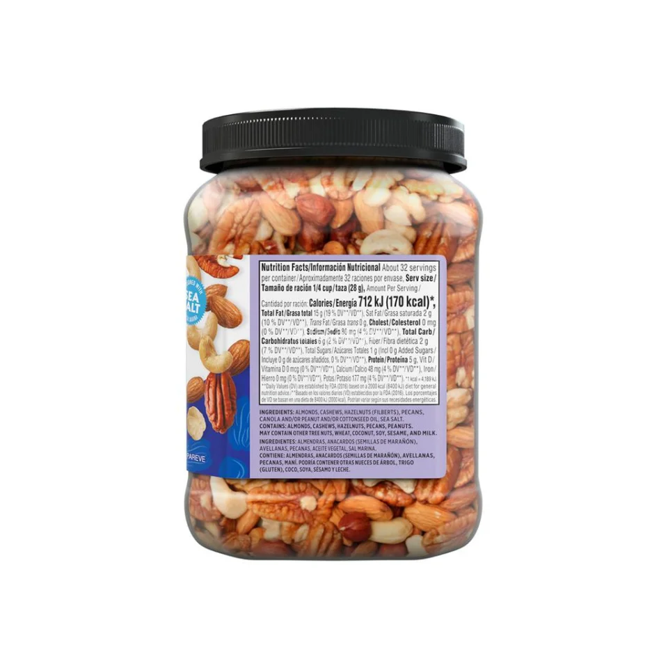 Product ready to eat | Store in a cool and dry place | Contains almonds, cashews, hazelnuts (filberts), and pecans seasoned with sea salt. May contain other tree nuts, wheat, coconut, soy, and milk. Net weight 907 g / 2 lb.