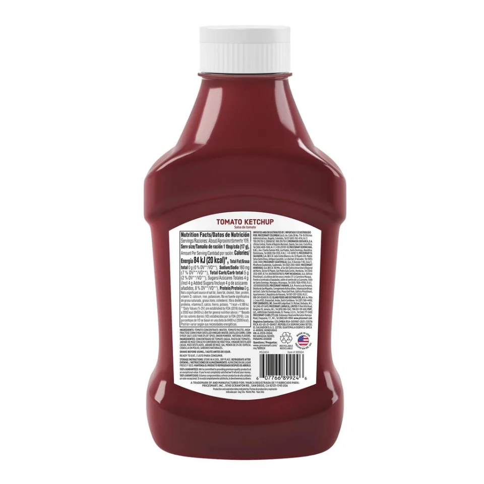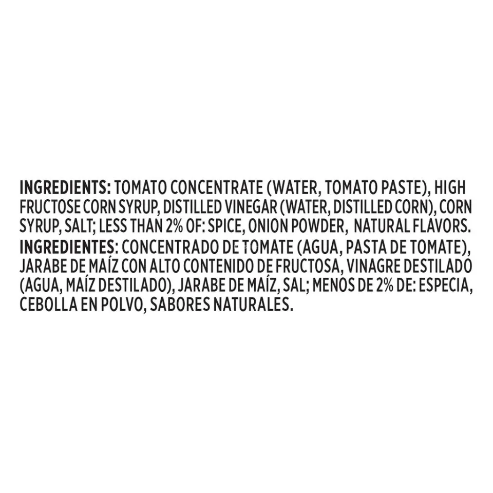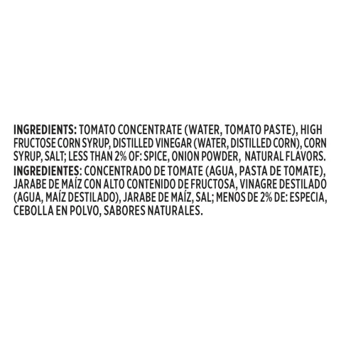 • Tomato Concentrate (Water, Tomato Paste), High Fructose Corn Syrup, Distilled Vinegar (Water, Distilled Corn), Corn Syrup, Salt; Less than 2% of: Spice, Onion Powder, Natural Flavors.