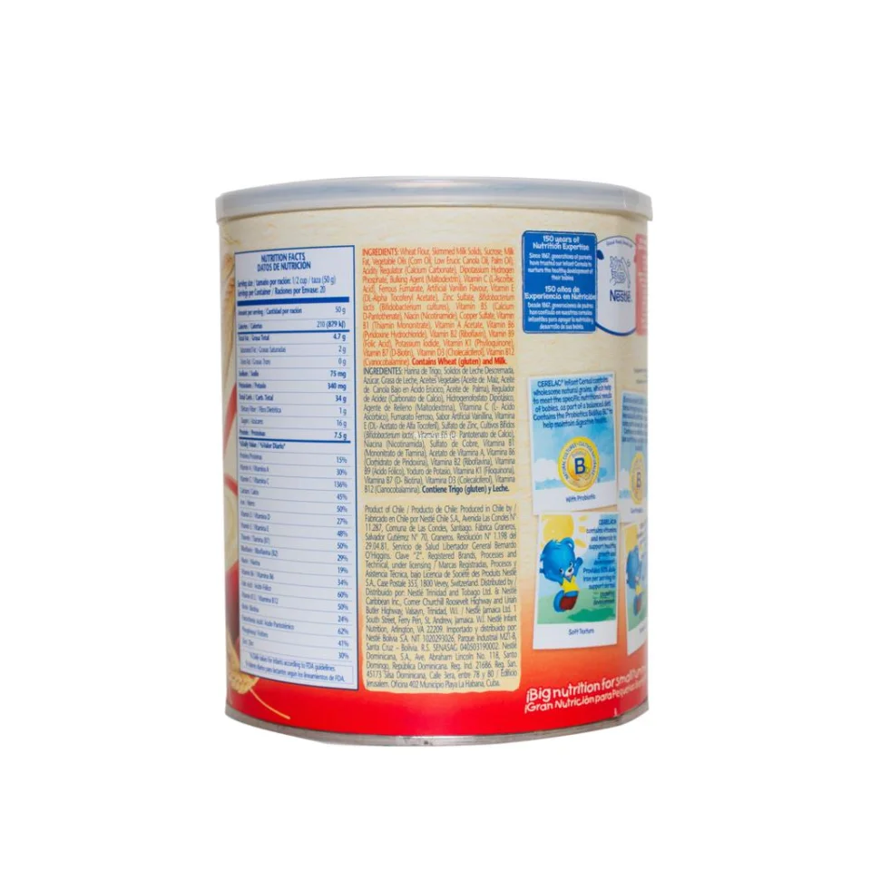 Wheat flour, Skim milk, Sugar, Whole milk, Rice flour, Vegetable oil blend (Corn, Canola and Palm olein), Corn flour, Butter, Barley flour, Oat flour, Calcium carbonate, Vitamins and minerals [Vitamin C, Ferrous fumarate, Vitamin E, Zinc sulfate, Calcium pantothenate, Vitamin B3 (Niacin), Copper sulfate, Vitamin B1 (Thiamine), Vitamin A acetate, Vitamin B3 (Pyridoxine), Vitamin B2 (Riboflavin), Folic acid, Iodine, Zinc sulfate, Vitamin B1 (Thiamine), Vitamin A acetate, Vitamin B3 (Pyridoxine), Vitamin B2 (Riboflavin), Copper sulfate, Vitamin B1 (Thiamine), Vitamin A acetate, Vitamin B3 (Pyridoxine), Vitamin B2 (Riboflavin), Folic acid, Potassium iodide, Vitamin K1 (Phylloquinone), Biotin, Vitamin D3 (Cholecalciferol) and Vitamin B12 (Cyanocobalamin)], Dipotassium phosphate, Probiotics (Bifidobacterium Lactis 10^6 cfu/g) and Flavoring (Vanillin).