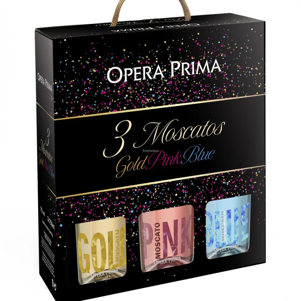Opera Prima Sparkling Moscato Wine | Country of Origin: Spain | Presentation: 3 Units of 750 mL / 25.36 oz | Varieties Included: Moscato Rosa, Moscato Oro, Moscato Azul | Color: Delicate pink, bright golden, and vibrant blue | Aroma: Floral and fruity, with fresh and sweet notes | Taste: Sweet, fresh, and well-balanced, with lively fruity nuances | Alcohol: 7% vol. | Ideal Consumption: Serve chilled, perfect for appetizers, celebrations, or pairing with desserts. *EXCESS IN CONSUMPTION OF THIS PRODUCT IS HARMFUL TO CONSUMER'S HEALTH - The sale of alcoholic beverages in any form to people under 18 years of age is prohibited.