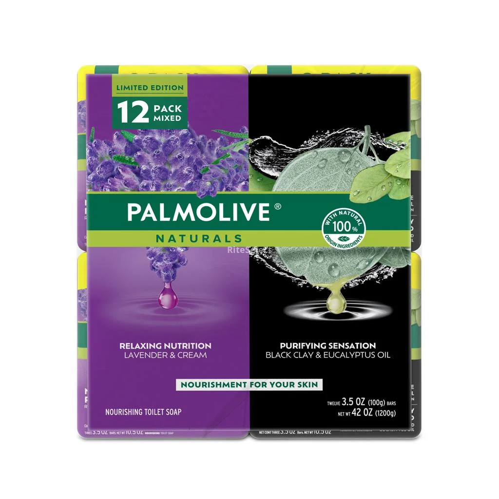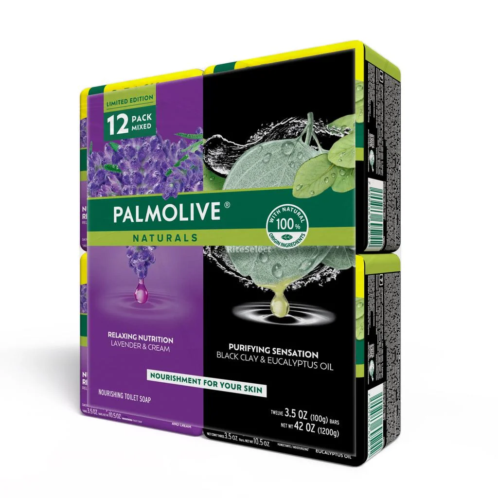 Palmolive Naturals bar soap | 12-Unit pack, 100 g each | Total net weight 1.2 kg | Contains 6 Lavender and Cream bars with natural lavender oil and moisturizing cream | Contains 6 Black Clay and Eucalyptus Oil bars with purifying herbal fragrance | Formulas with 100% natural origin ingredients | Recommended body use during daily bathing | Lather soap on wet skin and rinse with water | Store in a cool and dry place, away from direct sunlight | Origin: Mexico.