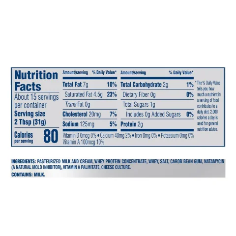 • Pasteurized milk and cream, whey protein concentrate, whey, salt, carob bean gum, natamycin (a natural mold inhibitor), vitamin A palmitate, cheese culture.
