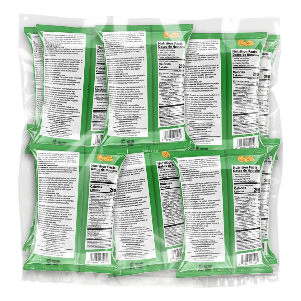 • Brand: Ripples | 12 Unit pack | Total net weight: 420 g | Weight per Unit: 35 g | Flavor: sour cream and onion | Contains: milk and soy | Made in Trinidad and Tobago | Store in a cool and dry place.