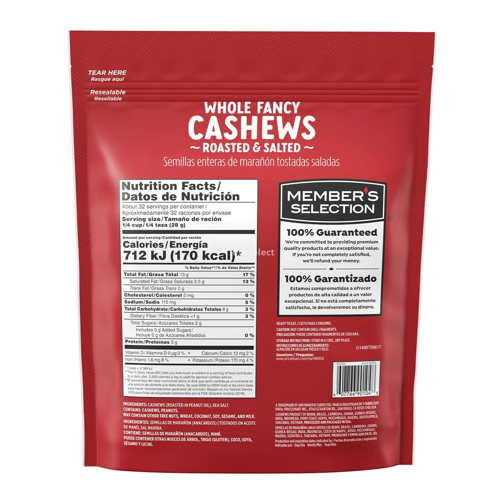 • Member's Selection Cashews are selected for their high quality, lightly roasted in oil for a crunchy texture, and then salted to perfection, offering a tasty snack ideal for direct consumption or culinary preparations. Packaged in a resealable bag to keep them fresh and crunchy.
