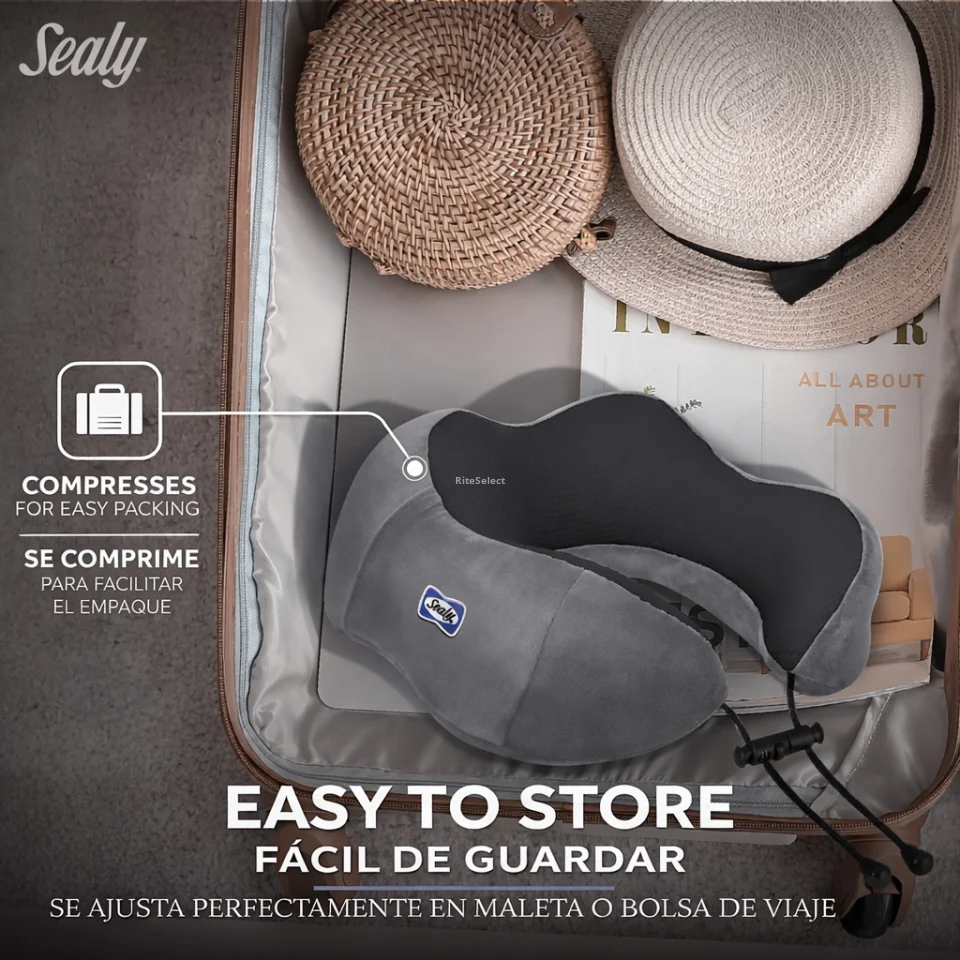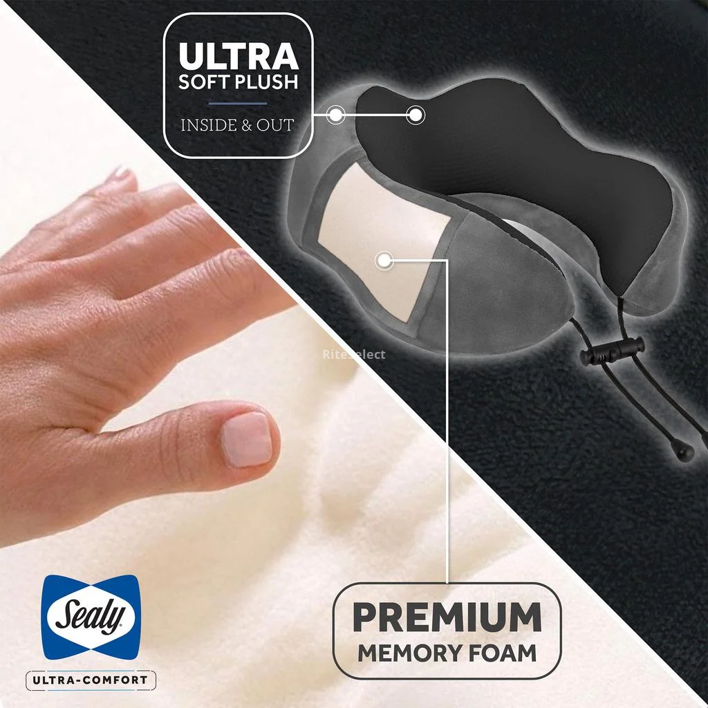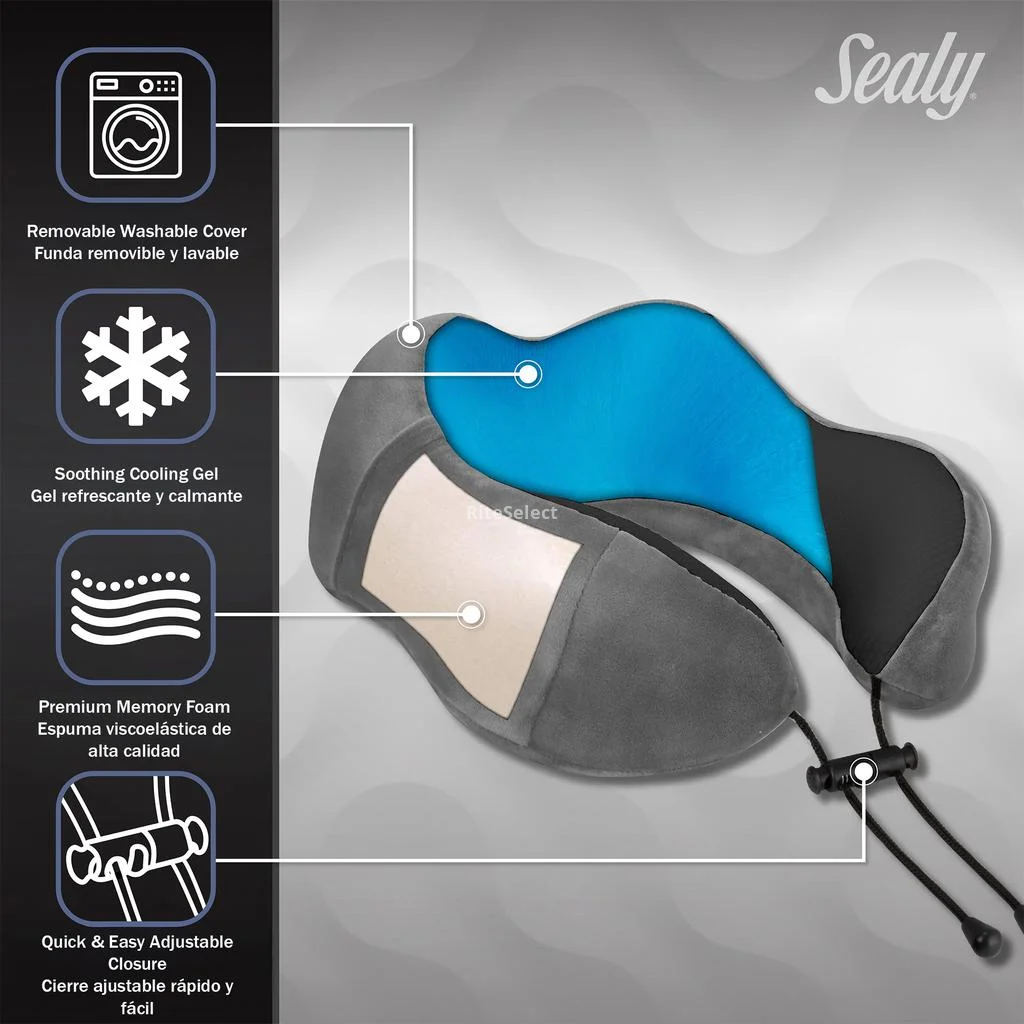 Travel in total comfort with the Sealy neck pillow featuring memory foam and cooling gel. Its ergonomic design provides ideal neck support and helps reduce pressure, keeping you cool and comfortable on flights, road trips, or for everyday rest.