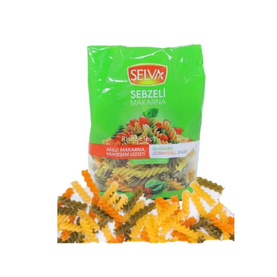 Pasta Selva Tricolor is a product made in Italy with 100% durum wheat semolina, without preservatives or artificial colors. Its mix of colors comes from natural ingredients such as spinach and dehydrated tomato. Each package contains 350 g. It mainly provides complex carbohydrates, with low fat content and a small proportion of vegetable protein. It is processed in accordance with strict hygiene standards and retains its firm texture when cooked.
