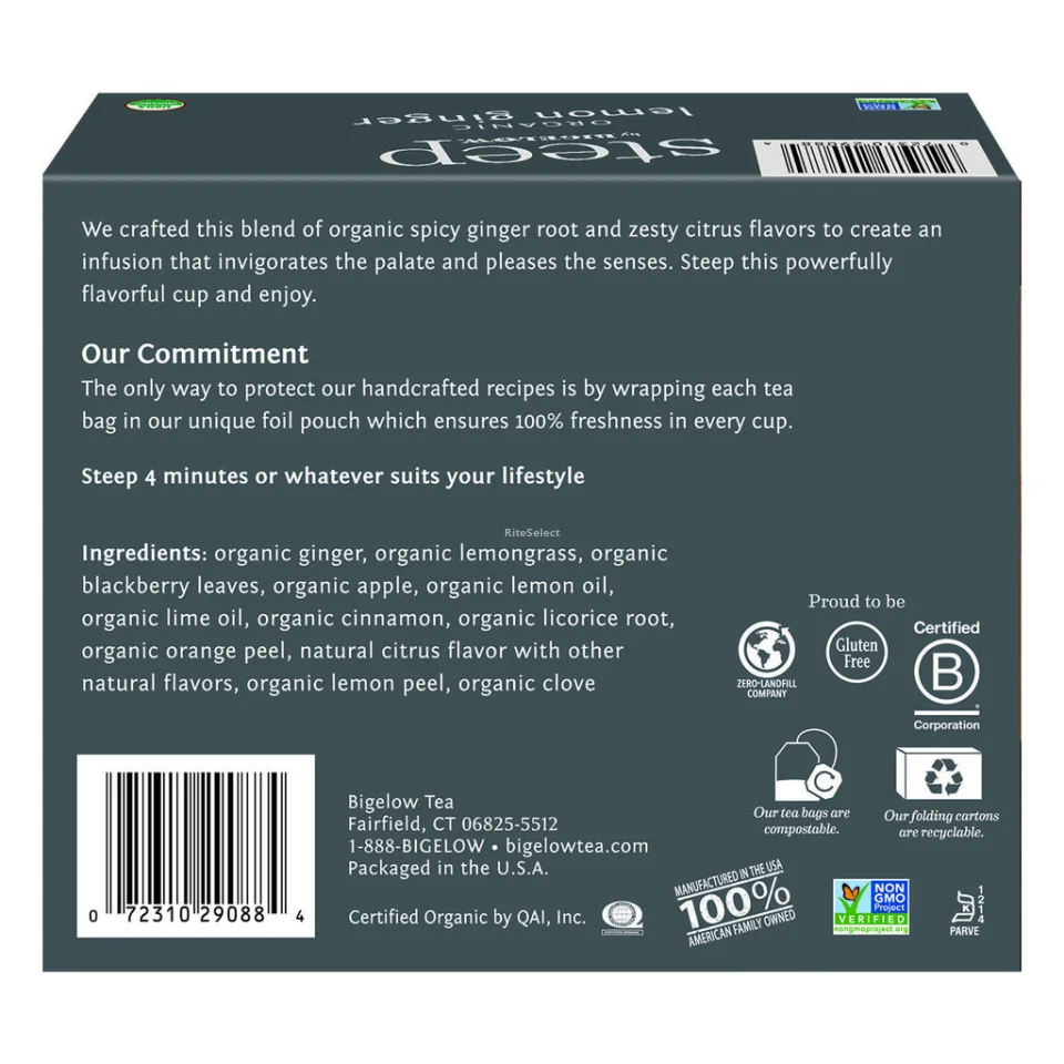 • Lemon Ginger Tea | Contains: 60 bags of 2.2 g (0.07 oz) | Total Weight: 132 g (4.65 oz) | Organic | Gluten Free | Kosher Parve | GMO Free | Compostable Tea Bags | Store in a cool, and dry place | Product manufactured in the USA.