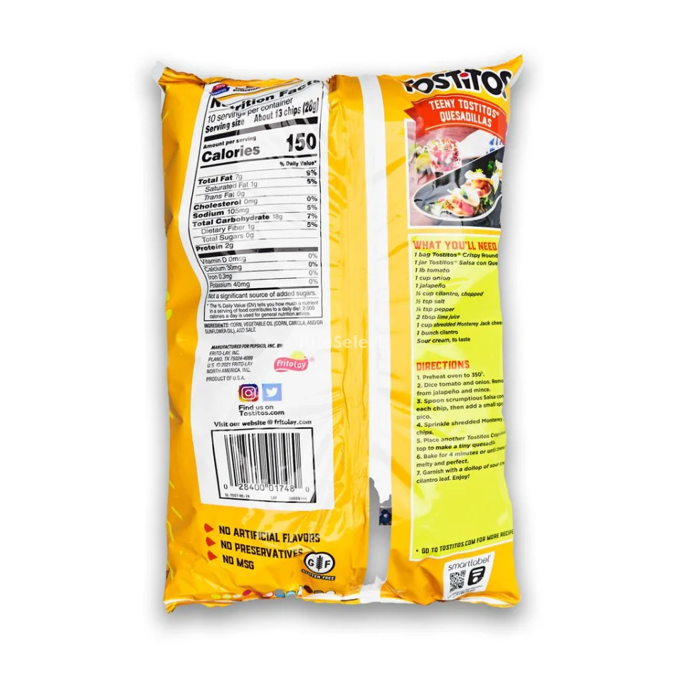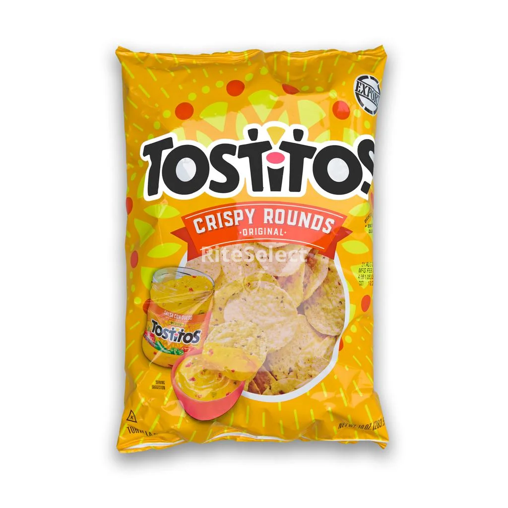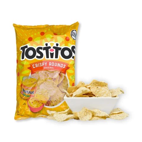 TOSTITOS Crispy Rounds Tortilla Chips 283 g are corn snacks made with simple and natural ingredients, mainly corn, vegetable oil and salt. These chips are designed to be crispy and round, facilitating their use to dip in sauces.