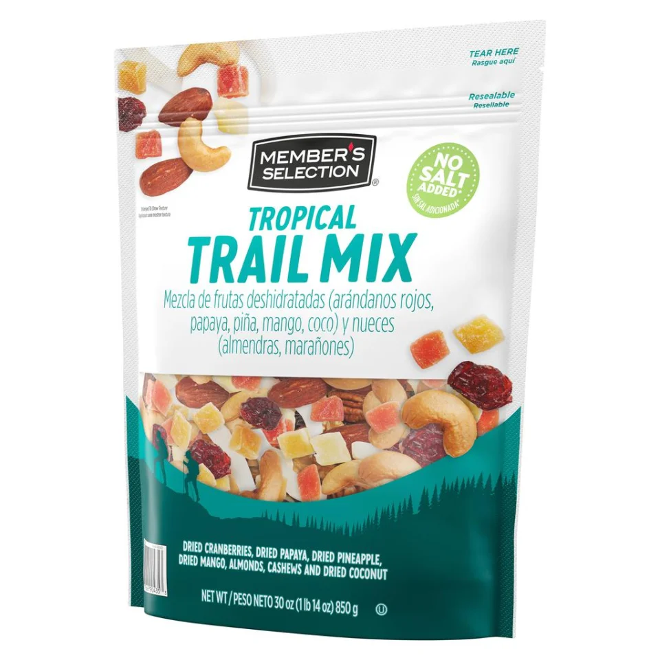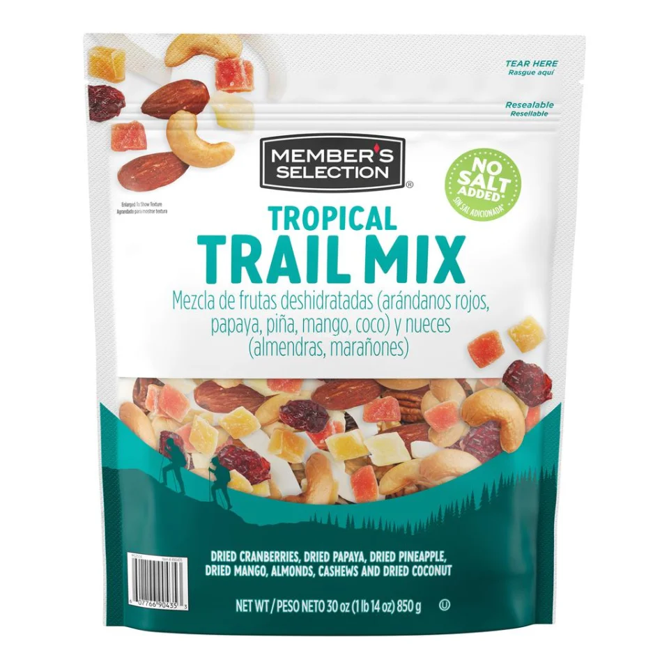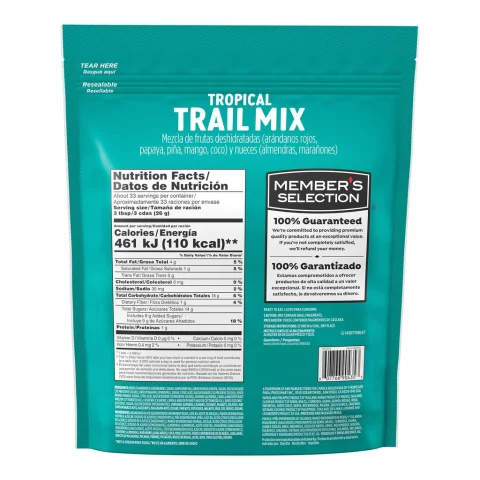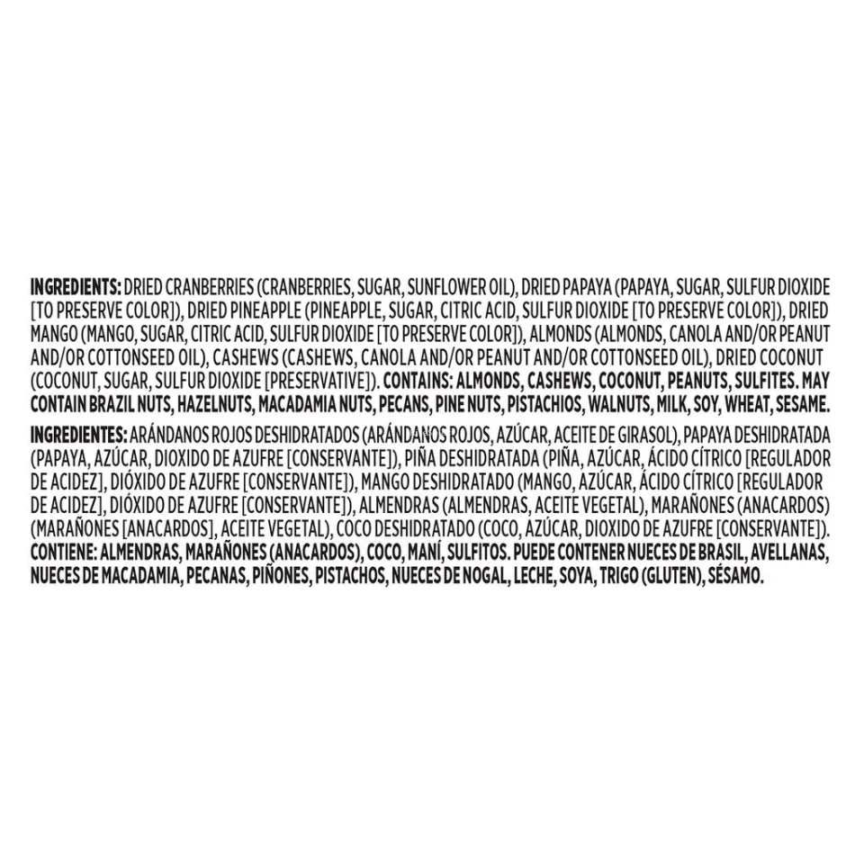 Dried cranberries (cranberries, sugar, sunflower oil), dried papaya (papaya, sugar, sulfur dioxide [to preserve color]), dried pineapple (pineapple, sugar, citric acid, sulfur dioxide [to preserve color]), dried mango (mango, sugar, citric acid, sulfur dioxide [to preserve color]), almonds (almonds, canola and/or peanut and/or cottonseed oil), cashews (cashews, canola and/or peanut and/or cottonseed oil), dried coconut (coconut, sugar, sulfur dioxide [preservative]). Contains: almonds, cashews, coconut, peanuts, sulfites. May contain brazil nuts, hazelnuts, macadamia nuts, pecans, pine nuts, pistachios, walnuts, milk, soy, wheat, sesame.