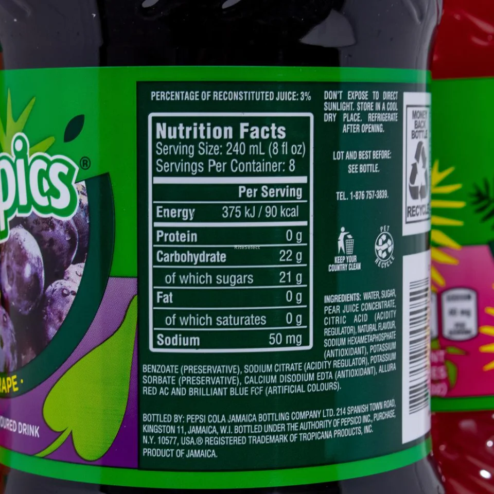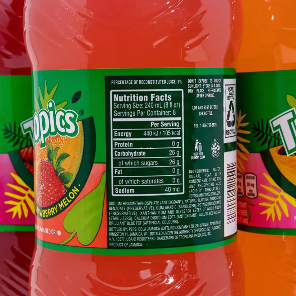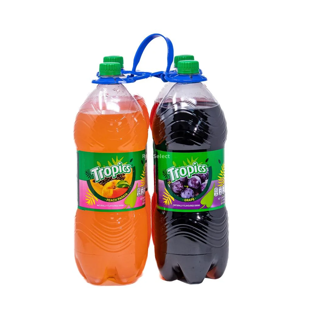 • Tropics' assorted juices include four 2-liter bottles each, featuring a variety of flavors that offer versatile options for different tastes. Available flavors include Fruit Punch, Strawberry Melon, Peach Papaya and Grape, each with distinctive profiles that combine sweet and fruity notes.