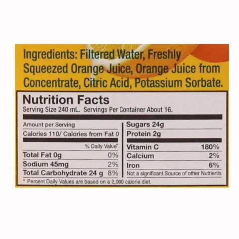 • Filtered Water, Freshly Squeezed Orange Juice, Orange Juice from Concentrate, Citric Acid, Potassium Sorbate.