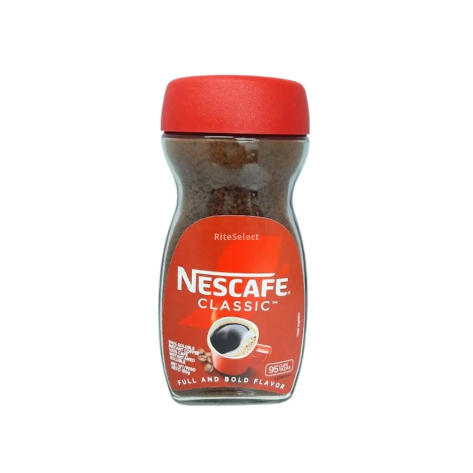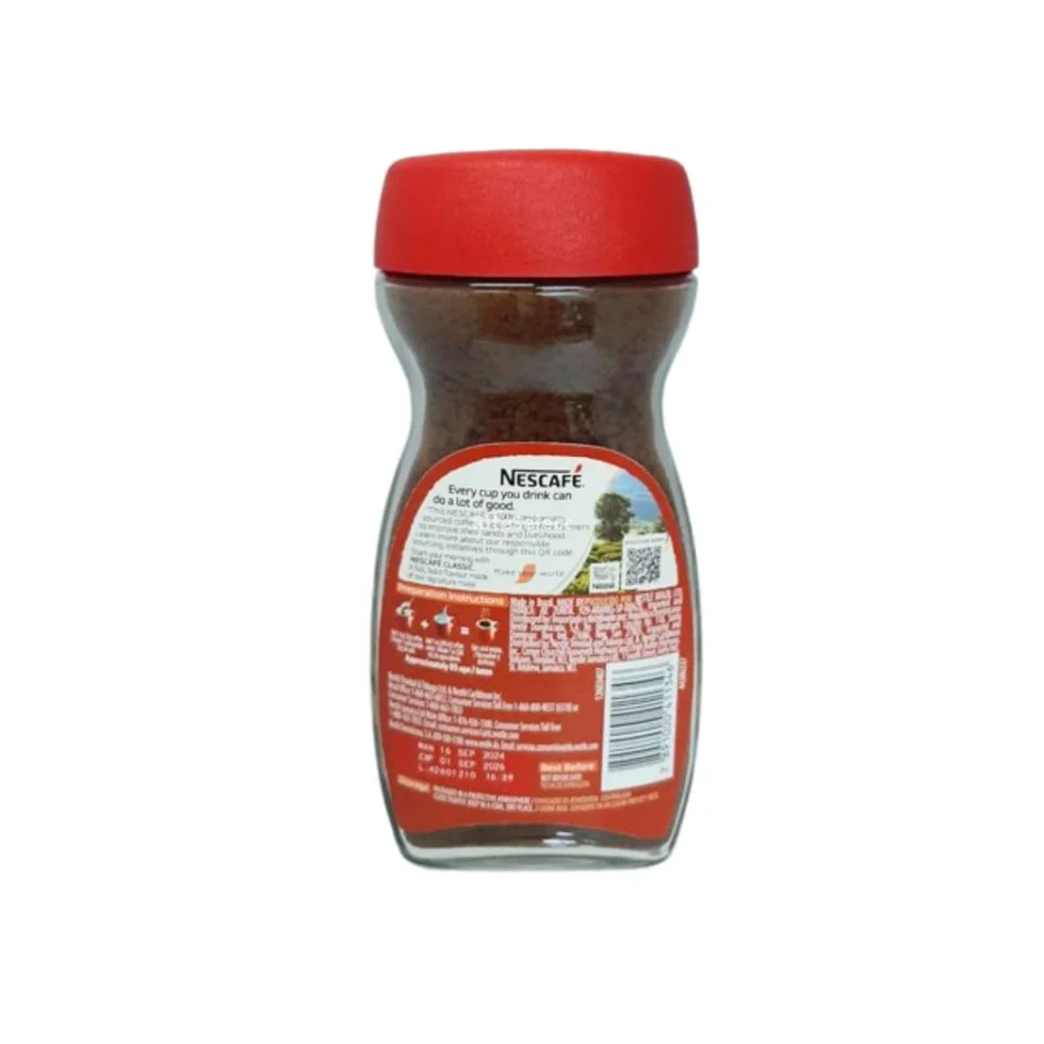 Nescafé Classic Instant Coffee | Country of Origin: Brazil | Roast: Medium-Dark | Ingredients: 100% Soluble Coffee (blend of Arabica and Robusta beans) | Net Weight: 190 g | Quantity per Package: 1 Unit | Production Process: Freeze-dried or spray-dried to preserve aroma and flavor | Storage Conditions: Keep in a cool, dry place and tightly sealed | Recommended Use: Hot or cold preparations (black coffee, lattes, cappuccinos, baking) | Benefit: Provides energy and focus thanks to its natural caffeine content.