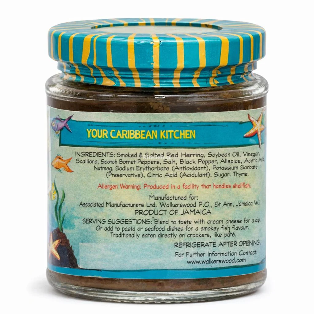 • Smoked and salted red herring, soybean oil, vinegar, onions, Scotch Bonnet chilies, salt, black pepper, red pepper, nutmeg, and preservatives.