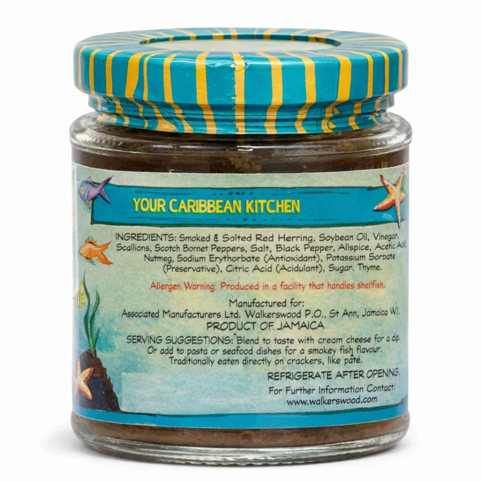 • Solomon Gundy smoked herring spread | Made in Jamaica | Content: 2 units | Net content: 160 g / 5.6 oz | Product type: Smoked fish pâté | Flavor: Spicy | Use: Spreads for salted cookies, dips, pastas, and seafood | Jars | Storage: Refrigerate after opening.