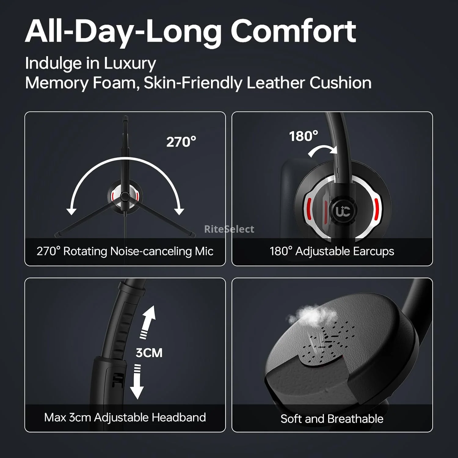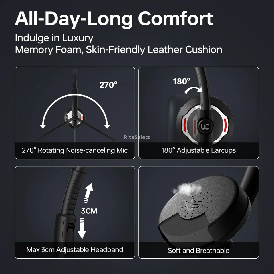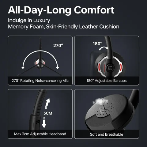 - All-day-long Comfort - Adjustable headband, earcups, microphone boom with a lightweight body, and the skin-friendly leather cushion covering the memory foam are perfect for all-day use