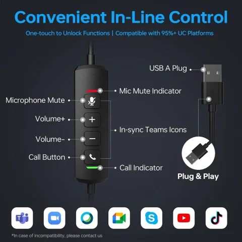 - In-Line Control - Experience heightened work efficiency with our handy In-Line Control, delivering an unparalleled audio experience at the press of a button. User-friendly and equipped with clear buttons-- Mic Mute/Unmute, Volume +/-, and MS Teams Call Answer/End