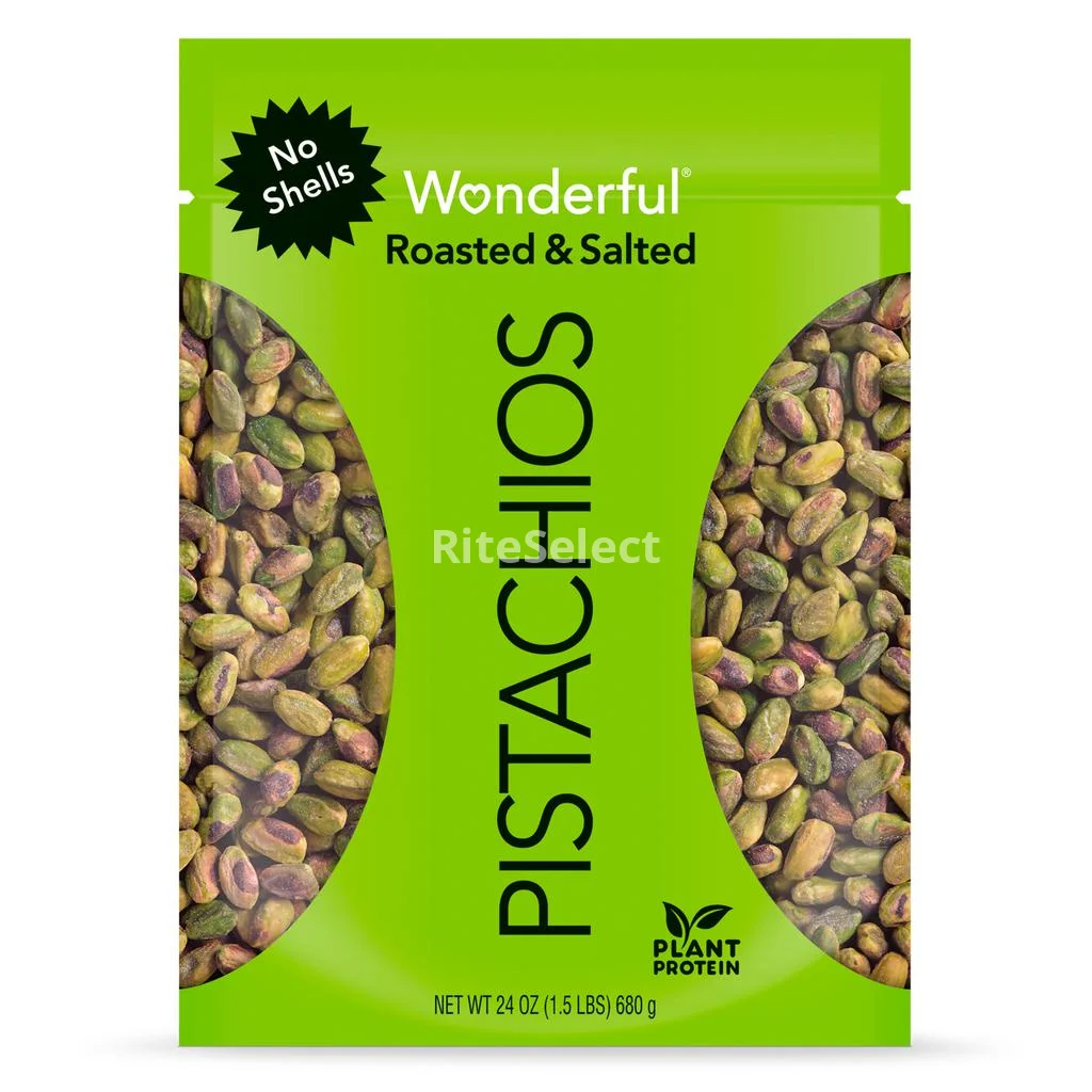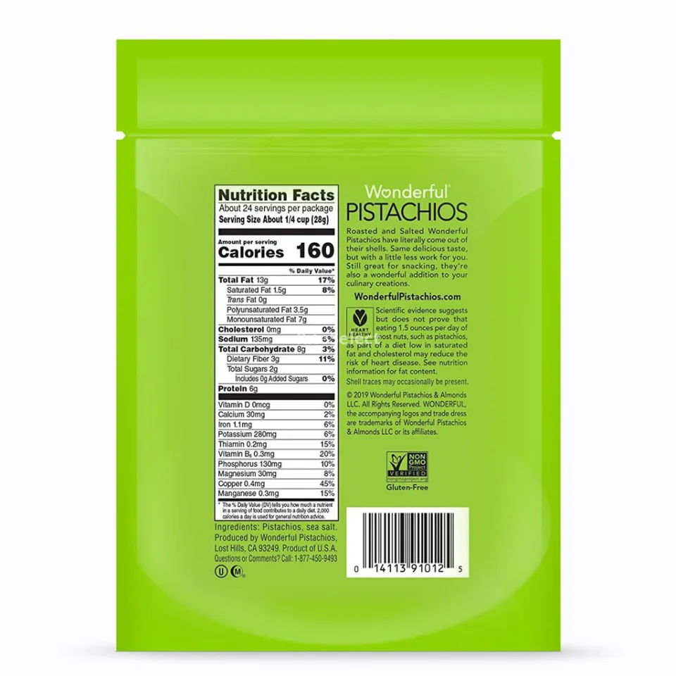 Roasted and salted pistachios | Roasting process to enhance flavor and texture | 680 g / 24 oz package | Natural source of plant-based protein | Gluten-free, suitable for wheat-free diets | NON-GMO certification (free of genetically modified organisms) | Provides fiber, protein, and healthy fats that contribute to a balanced diet | Ideal as a nutritious snack, to complement breakfasts, salads, desserts, or culinary preparations | Made in the United States.